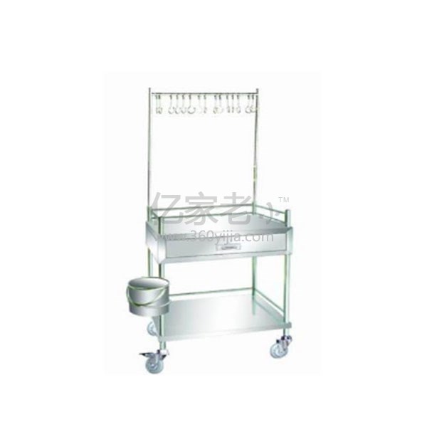 4个万向脚轮,对角刹车。带一个大抽屉,一个污物桶,一排挂钩。