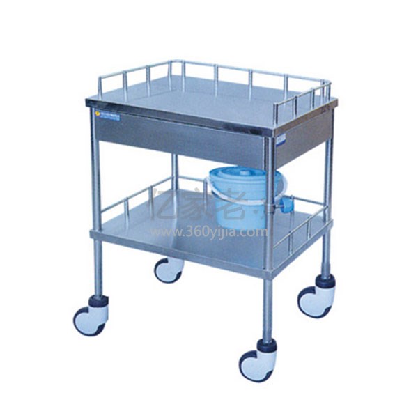 1:治疗车分为上下两层,均带有不锈钢护栏,上层带抽屉。采用静音滑轨,抽拉轻松灵活,可存放一次性输液器、棉签、纱布等,另配有不锈钢污物盆、针剂盘;底层带塑料污物桶,方便实用。