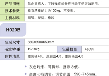 【产品名称】H020B座厕椅 【产品类别】轮椅车/助行器系列 【产品编号】H020B