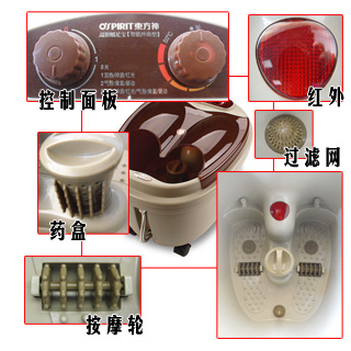 产品底部设有穴位滚动按摩轮,可刺激脚部各个穴位,并设药盒功能(只要将药盒盖垂直向上提起、装入药包即享受药浴)。