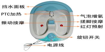 ● 自动加热 ● 持续恒温● 振动按摩 ● 舒适搓脚 ● 气泡增氧 ● 旋钮开关 |