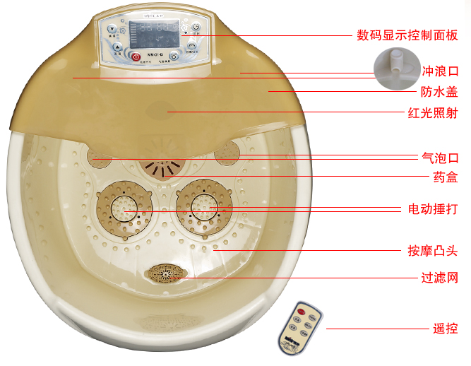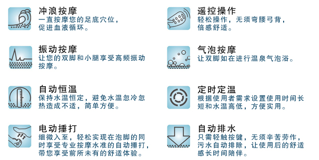 电动捶打足浴按摩器开创者 大多数在使用足浴按摩时,仅靠自己双脚的运动来实现对脚底的按摩, 既无法保持充足的时间来获得按摩的舒适,同时对按摩的效果也大打折扣。 美妙“电动捶打”足浴按摩器, 轻松实现在泡脚的同时享受专业按摩师水准的自动捶打,带您享受前所未 有的舒适体验。