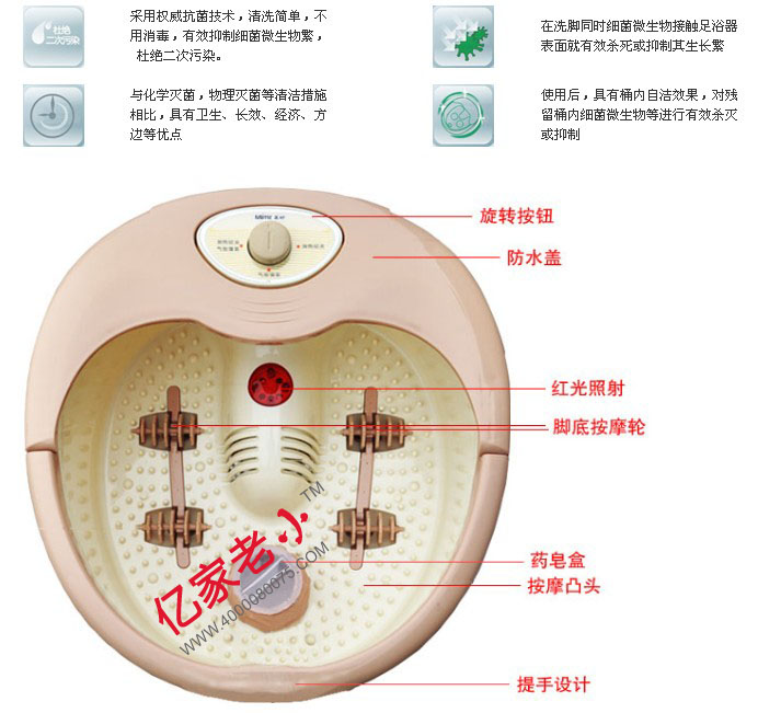 电动捶打足浴按摩器 大多数在使用足浴按摩时,仅靠自己双脚的运动来实现对脚底的按摩, 既无法保持充足的时间来获得按摩的舒适,同时对按摩的效果也大打折扣。 美妙“电动捶打”足浴按摩器, 轻松实现在泡脚的同时享受专业按摩师水准的自动捶打,带您享受前所未 有的舒适体验。